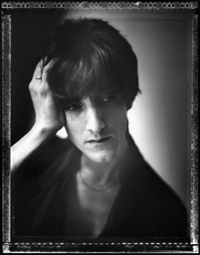 Test print, taken in 1988 by Manchester photographer Mark Warner of Vini Reilly. Mark used a Polaroid negative/positive process on this shoot which gives the distinctive 'framing' on the image. This is a contact print from the original 5"x4" negative. The image was used cropped for the 1989 Factory album 'Vini Reilly' Fac 244.