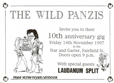 Wild Panzis 10th anniversary ticket/flyer. This started a run of gigs at the Star and Garter where we found we could hire the place, get a couple of bands, play our own DJ music, and generally not feel ripped off with the usual pay to play policy. These were usually pretty good gigs now that the wave of mancy-beat bands had settled down...we did an acoustic gig in this run also that worked really well.