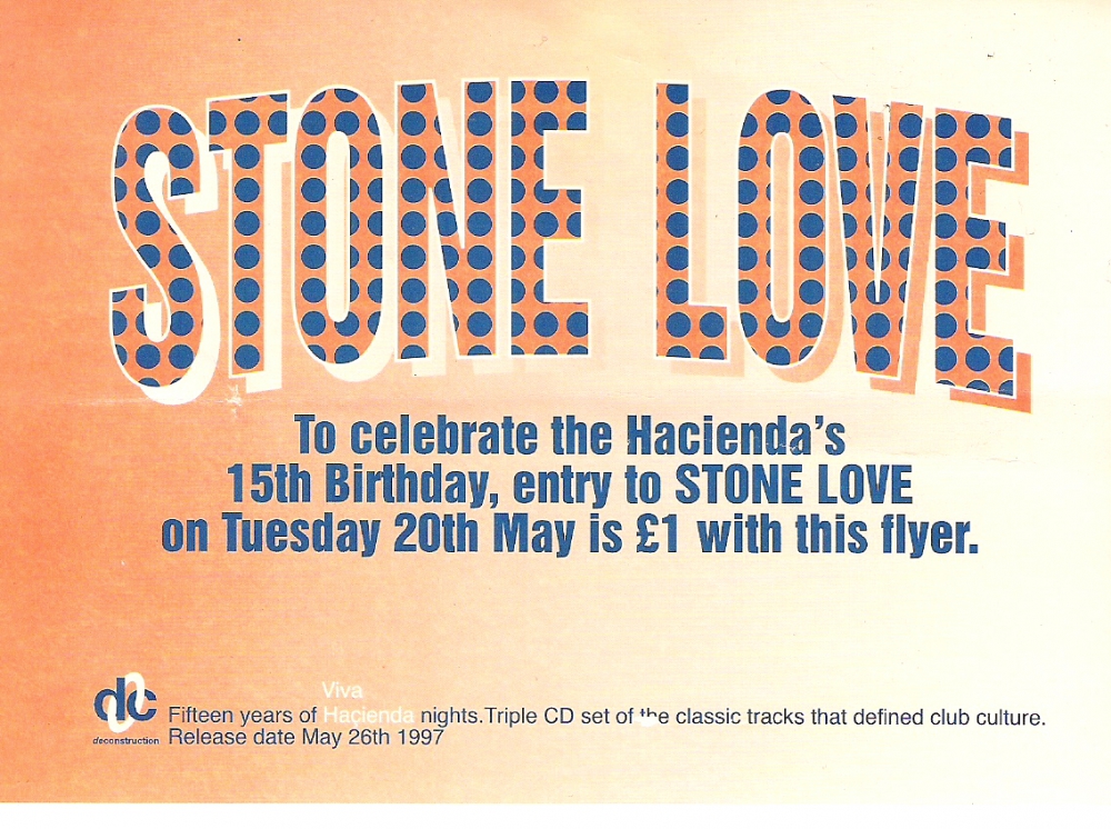 hacienda 15th Bithday party....Flyer for Stone Love the regular 'Indie' night.