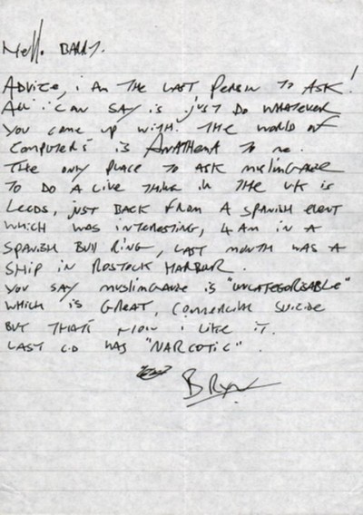 This is a letter from Bryn Jones (Muslimgauze) to Barry Williams of the manchester based experimental/electronica label Fflint Central.