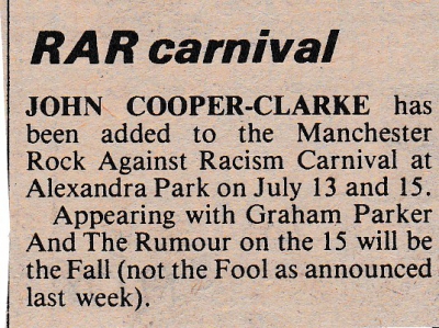 An article about the Rock Against Racism Carnival featuring The Fall, from Sounds magazine, 15/7/78.