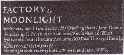 Advert for the series of Factory Nights at West Hampstead Moonlight Club in April 1980. Joy Division were an unannounced performer on all three nights