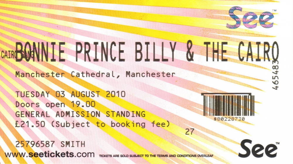 Ticket for Bonnie 'Prince' Billy at Manchester Cathedral. Pic by Phil King (Contact: