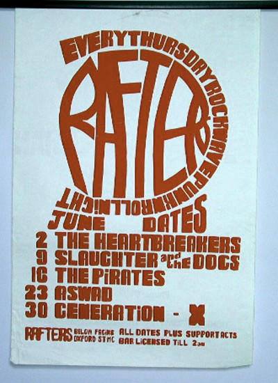 You can tell by the line-up on this poster how important Rafters was in the gigging circuit of punk bands. Generation X (with Billy Idol), The Pirates and The Heartbreakers were all significant punk bands and Aswad were a force amongst (British) reggae, which was embraced by many punks.