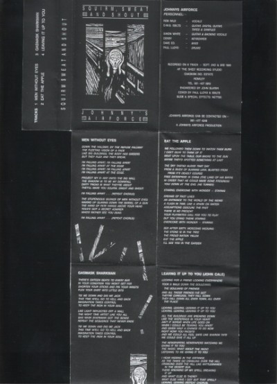 The rather complex "gatefold" cover to Squirm,Sweat and Shout which was The Airforces 2nd Demo tape. It has lyrics printed in full and required a degree in Origami to fold back into the cassette cover. The Lyrics for side 1( if you can make them out) were largely nonsensical and made up of lines lifted from Readers Digest selected at random whilst emptying ones bowels and reassembled to sound meaningful at a later date. The Lyrics for Gasmask Sharkman were penned by one Nigel Hebblethwaite who was great at writing lyrics but unable to bring himself to perform live and was responsible for words to many of the tunes by The Men of 992. Leaving it up to you was written by John Cale and was the best tune on the tape by all accounts...We got some good reviews though in a few magazines and sold quite a few at gigs