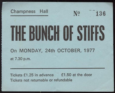 Ticket for the 'Bunch of Stiffs' tour which featured a variety of artists from the Stiff record lablel, including Wreckless Eric, Ian Dury, Nick Lowe, Elvis Costello and Larry Wallis. The gig was at Champness Hall in Rochdale on the 24th of October 1977.