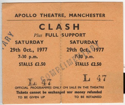 Ticket for Clash gig at the Apollo Theatre, Manchester on 29th of October 1977.