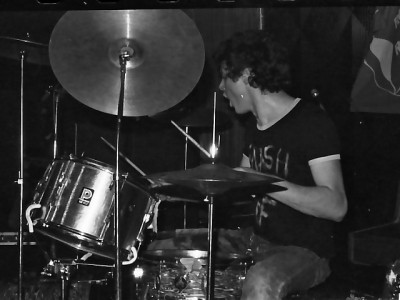 Rock Against Racism gig at Crystals nightclub in Bury. The Nosebleeds were with John Cooper-Clarke and Fastbreeder. This is Toby playing to the occasion with "crush NF" on his tee-shirt. He went on to join Primal Scream amongst others