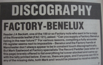 This is a Factory Records catalogue list from the NME, and it includes Vini Reilly, New Order