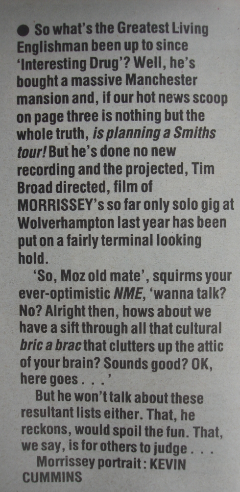 This is a double page article in the NME about Morrissey, and it includes Vini Reilly.