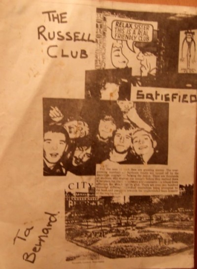 Back cover of the 4th issue of City Fun with pictures of the inside of the Russell Club and some of the club clientele. Why Bernard was being thanked god only knows. I recall someone telling me that Bernard was infact Gordon the Moron but it could be a lie