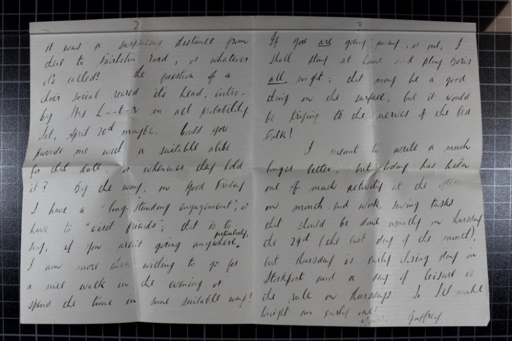 If he can't see her for a walk then "I shall stay at home and play Boris all night; that may be a good thing on the surface but it would be trying to the nerves of the Old Folk."