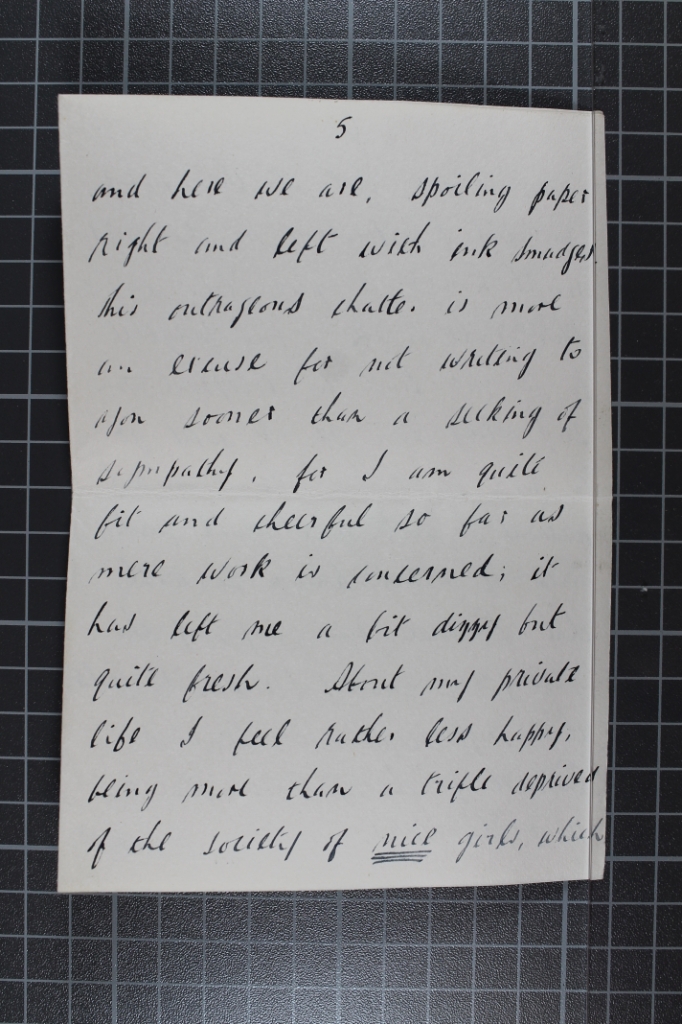 He's feeling fit and cheery but "about my private life I feel rather less happy, being more than an trifle deprived of the society of nice girls." Not that he's been spending time in the company of "nasty (or horrid) girls" he assures her. He fancies going for a walk with her but it being nearly midnight he reckons he should probably go to bed instead.