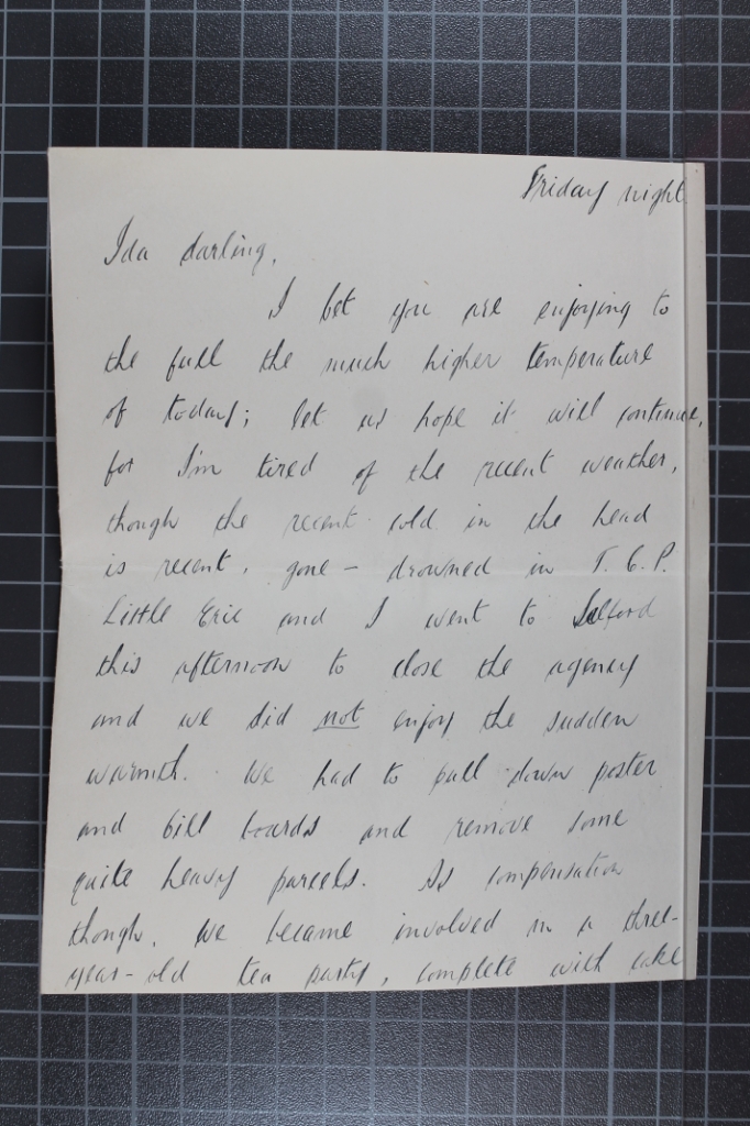 Griff has treated his cold with TCP, he writes to Ida. He's gone to close up the Salford branch of the travel agency and the heat of the day did not make it a pleasant job. Although they did somehow get involved in a child's tea party, cake and all.
