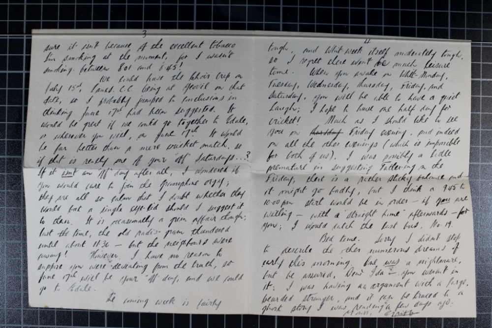 He hopes to take a day trip with her or, failing that, "I wonder if you would care to join the gramophone orgy" of him and his parents sitting listening to recordings.