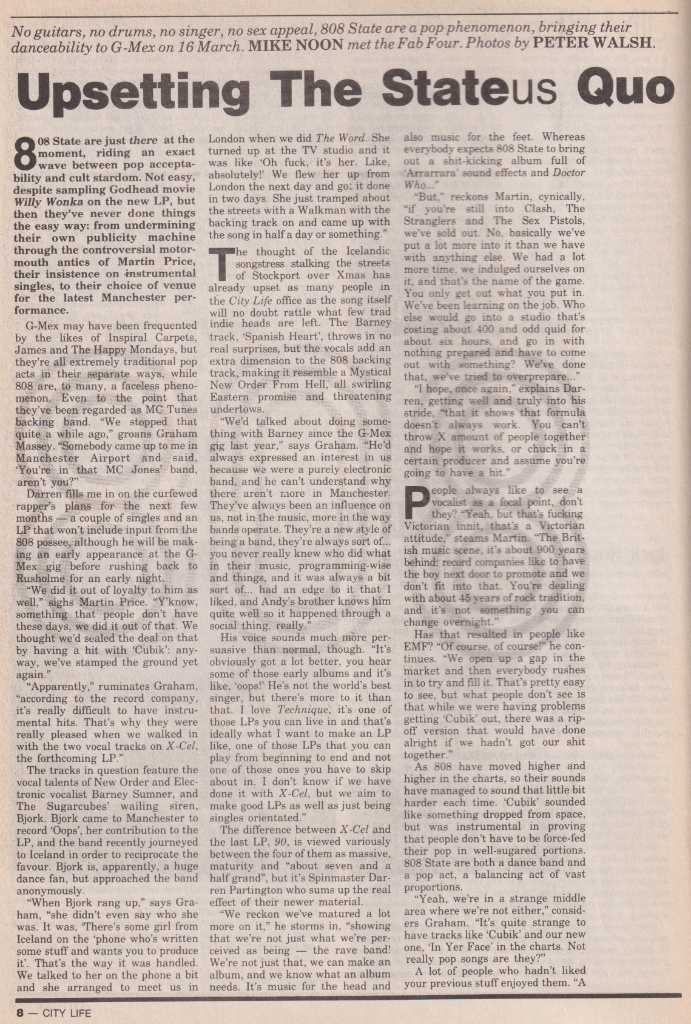 Cover of City Life 171 featuring 808 State and accompanying interview by Mike Noon. Photographs by Peter Walsh.