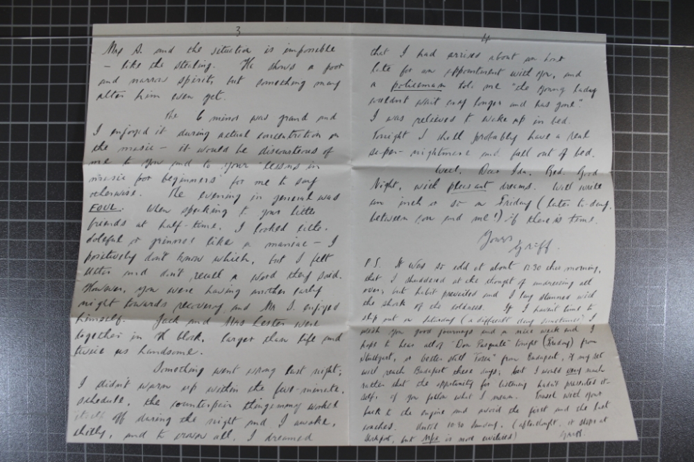 Griff writes to Ida thanking her for visiting even when she's a sore throat. He counts the minutes he spent with her compared to the hours without, but feels guilty for keeping her out at a concert so late.
