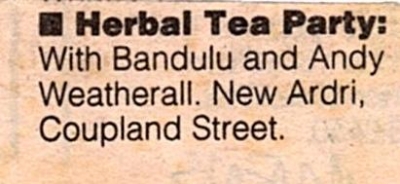 Manchester Evening News listing for for Herbal Tea Party at the New Ardri on 9 February 1995. Three hour set from Andrew Weatherall. Live the dub techno sounds of Bandulu (Infonet) and resident Rob Fletcher. Techno, tech house, acid, progressive house, minimal, electro, dub techno, dub house