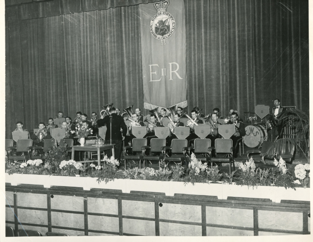 The CWS Manchester band on stage. Possibly in Wales given the language on the banner?