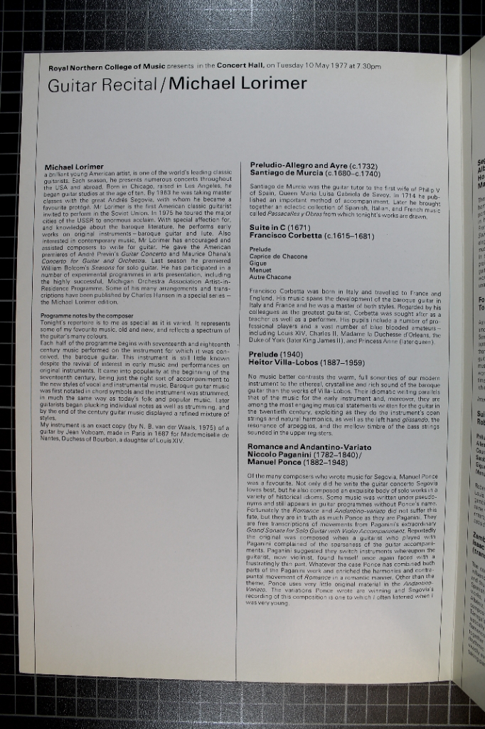 May 1977 at the RNCM was a guitar recital. About 85 years earlier, the founder of the Royal Manchester College of Music Charles Hallé said of the guitar: "the less that instrument is cultivated, the better". Luckily, we know better now!