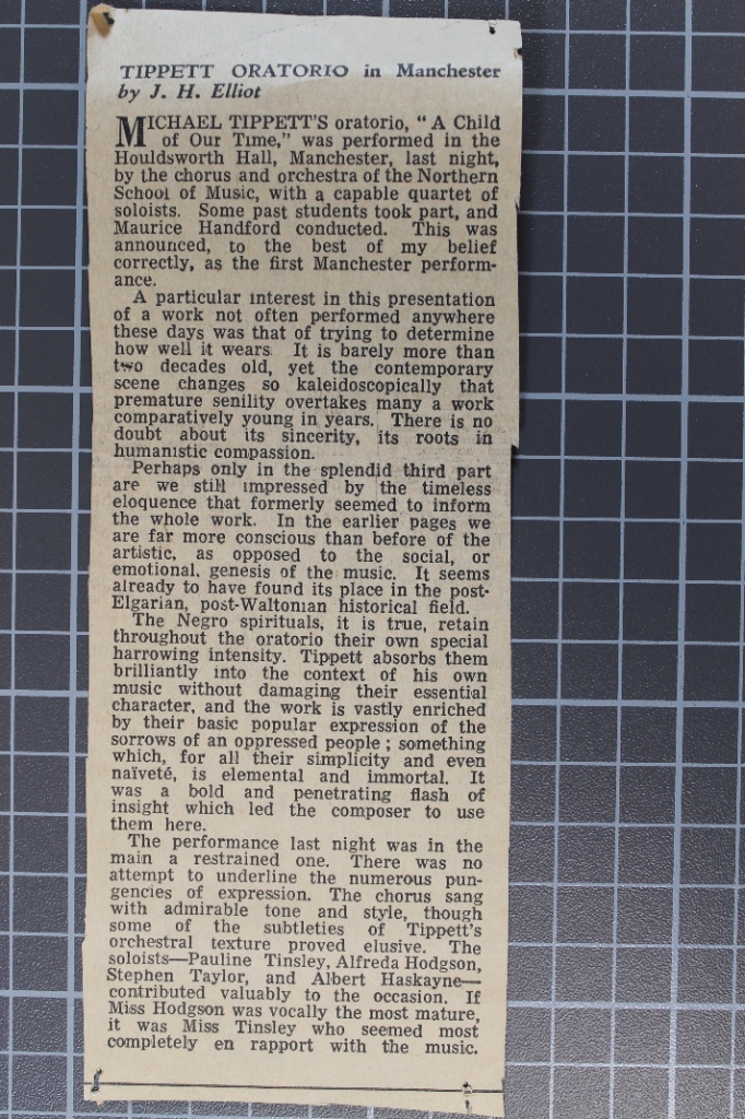 The Northern School of Music loved an oratorio and Michael Tippett's "Child Of Our Time" was "among the finest" of their performances. Special mention to Pauline Tinsley, Alfreda Hodgson, Stephen Taylor and Albert Haskayne.