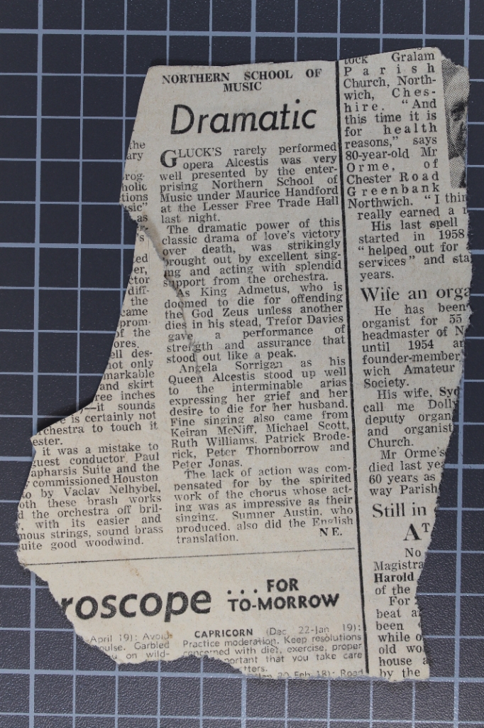 The Northern School of Music stage Gluck's opera "Alcestis". Produced by Sumner Austin and featuring Trefor Davies, Angela Sorrigan, Keiran McNiff, Michael Scott, Ruth Williams, Patrick Broderick, Peter Thornborrow, and Peter Jonas.