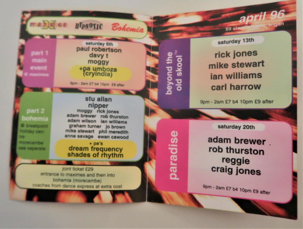 Fold-out flyer listing doings for April 96 at Maximes in Wigan's Saturday night session, Paradise, with a Shades of Rhythm PA.