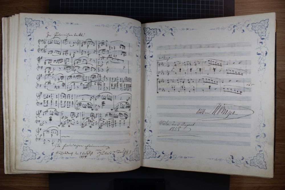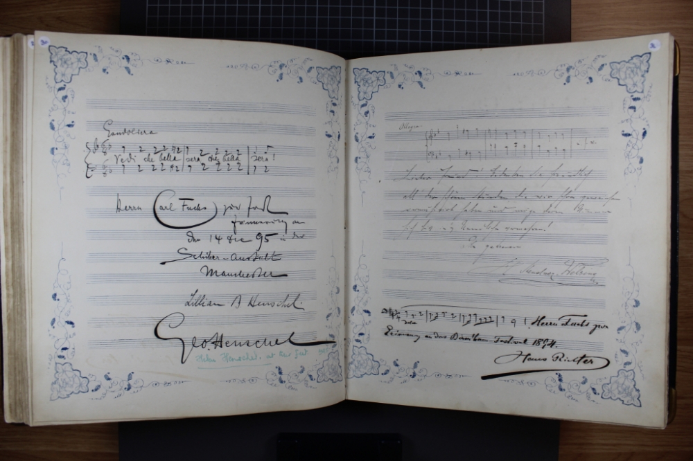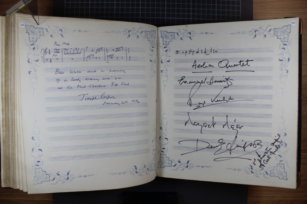 Behold! The family autograph album of the Fuchs family! Originally from Germany, their journey to Manchester started with Carl Fuchs who was a cellist in the Brodsky Quartet and cello tutor at the Royal Manchester College of Music. This album not only contains signatures of famous folk in the music world like Sergei Rachmaninoff, Edgar Bainton and John Ireland. Oh no. Not to do anything by halves, the family collected little ditties from these famous folk instead. That's right! It's a musical autograph book. Have a browse through its many pages and see who you can find.