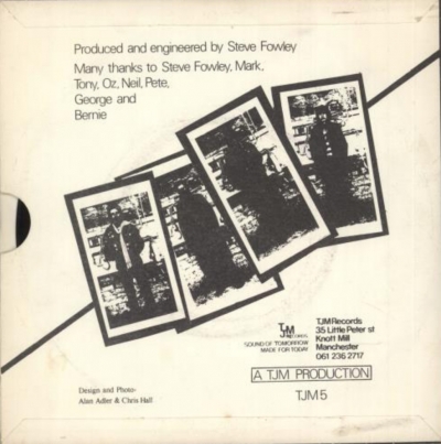 Reverse of Frantic Elevators single Voice in the Dark with photographs of the Elevators by the Manchester fine artist Chris Hall (also bass player (not the frantics) and photographer).