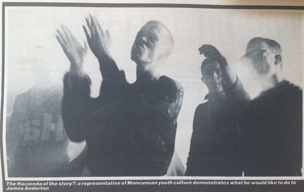This is a review from the NME about The Hacienda, and it includes New Order, Vini Reilly, Swing Out Sister, Mick Hucknall, Revenge, Paul Cons, Paul Ryder, Happy Mondays, Mike Pickering, John Robb, Membranes, Johnny Marr, Andy Rourke, and Shaun Ryder.