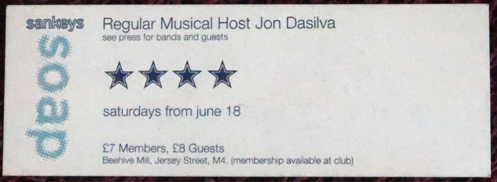 A small, double-sided, card flyer for an early night at Sankeys in June 94, with Jon Dasilva taking care of proceedings.