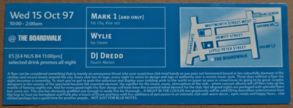 A double-sided card strip flyer for A Night in the Cooler at the legendary Boardwalk, 15th October 1997, featuring Fat City's Mark One.