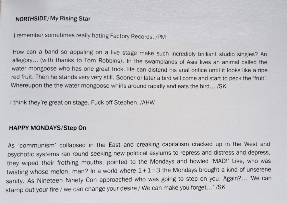 Letter from Tony Wilson asking me to write some sleeve notes for the Palatine Factory Record compilation. I did and he wasn't pleased with my subsequent Northside review, telling me to "fuck off" on his Northside review notes- is that an honour? My reviews end SK, Wilson's AHW