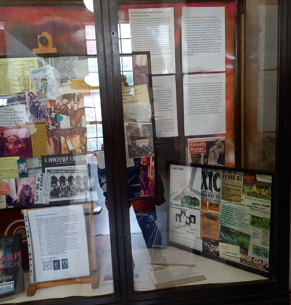 Frame on Fast Cars history added to the punk exhibition in Central Library Manchester October 2025, includes record cover, various posters, bits from City Fun, New Manchester Review and band photos