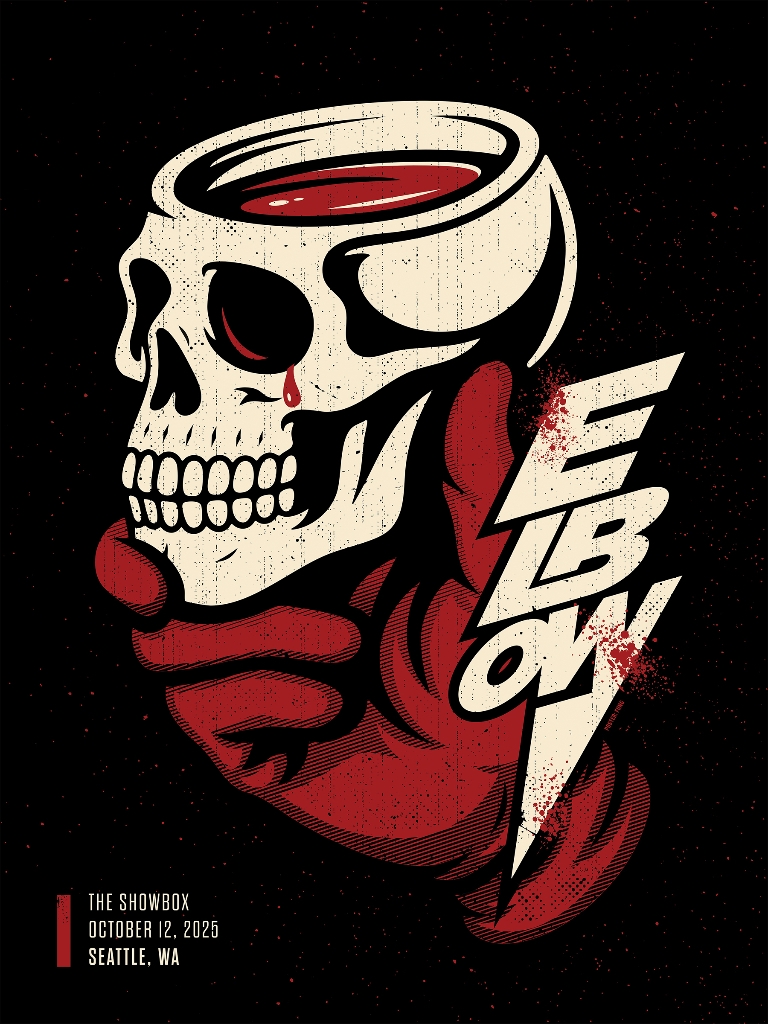 2-color screen printed poster for Elbow’s show at the Showbox in Seattle, Washington USA. October 12, 2025. Based on lyrics from “Balu.” off “Audio Vertigo.”