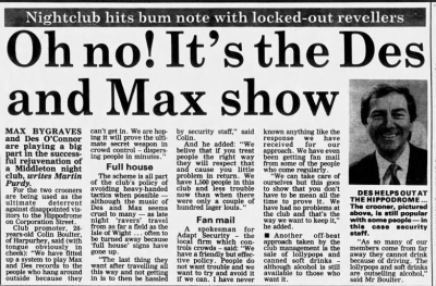 Piece in the 'Middleton Guardian' dated 21st November 1991, detailing Hippos' unique method of dispersing the unlucky who failed to gain entry to their club nights.
