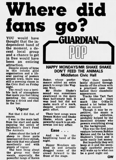 Review in the Middleton Guardian about the Happy Mondays gig on Friday 29th May 1987.