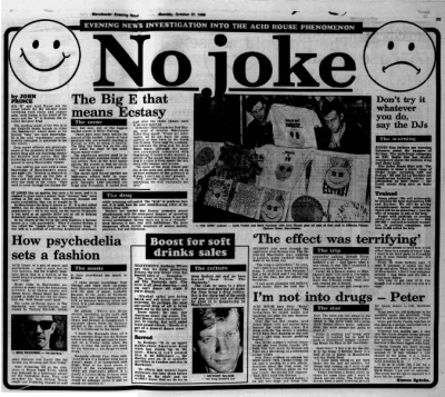 Quality journalism from the 'MEN' about the nascent 'acid house' scene. Mentions given to The Hacienda, Paul Cons, Tony Wilson, Mike Pickering and Baby Ford (who's from Bolton); with an allusion to the 'Sweat it Out' warehouse party.