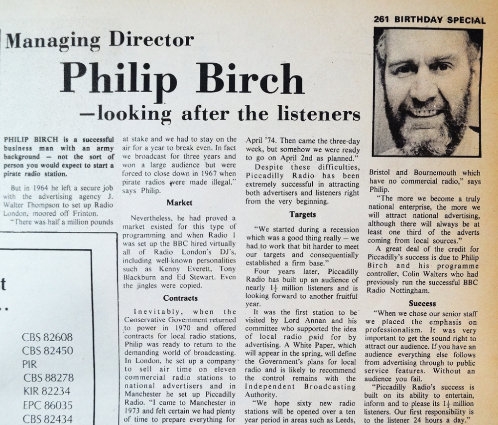 Article about Managing Director Philip Birch from the birthday special Piccadilly Radio newspaper (possibly 1st birthday in 1975).