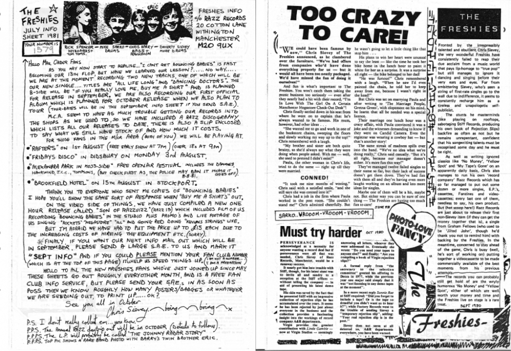 Freshies Info Sheet July 1981. Chris Sievey's way of keeping fans of the Freshies aware of events.