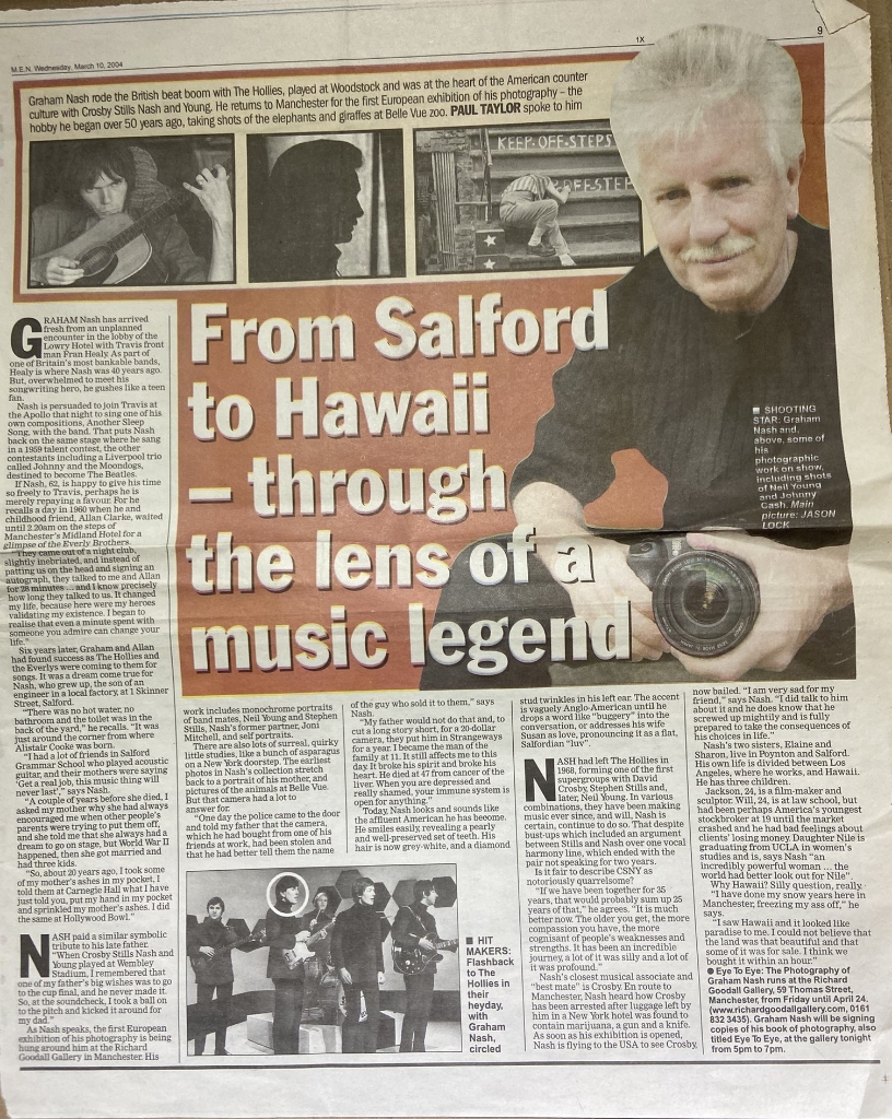 Manchester Evening News interview with Graham Nash when he was in town for the opening of the "Eye To Eye" exhibition of his photography.