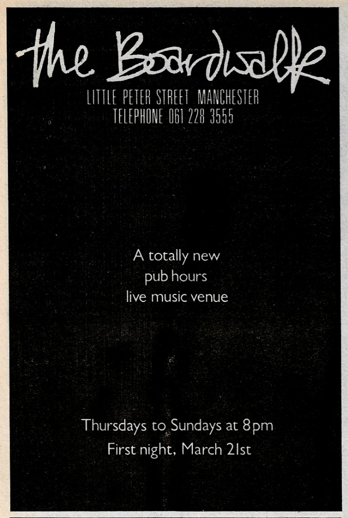 Advert for the first night of The Boardwalk as a venue proper with 'pub hours'.
