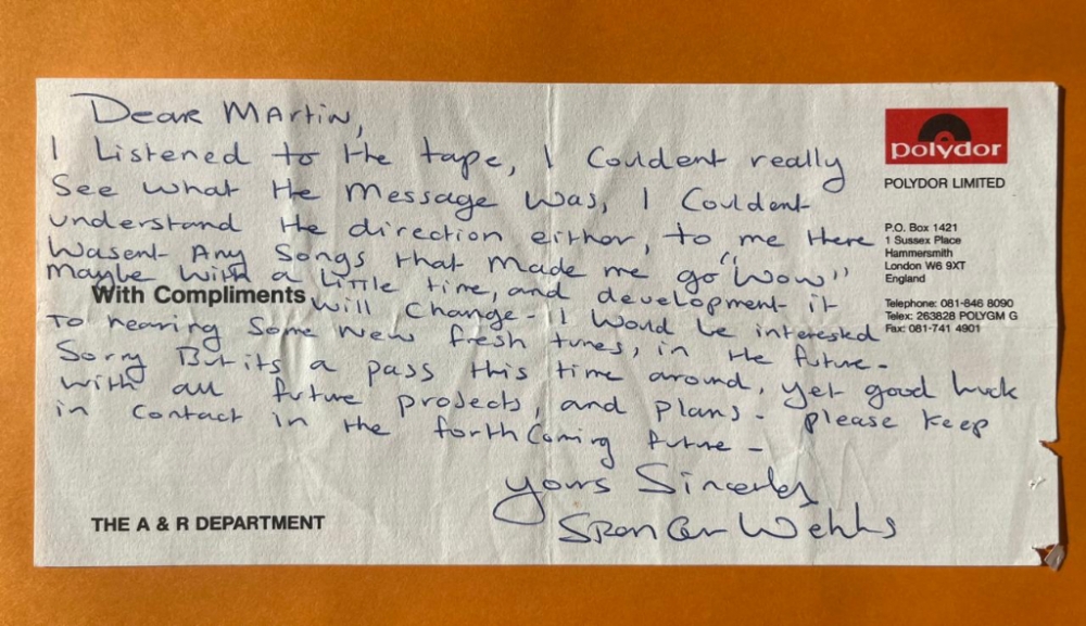 Letter from A&R man Spencer Wells from Polydor Records