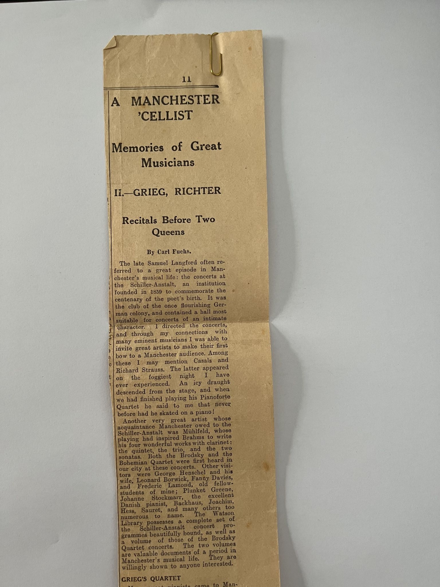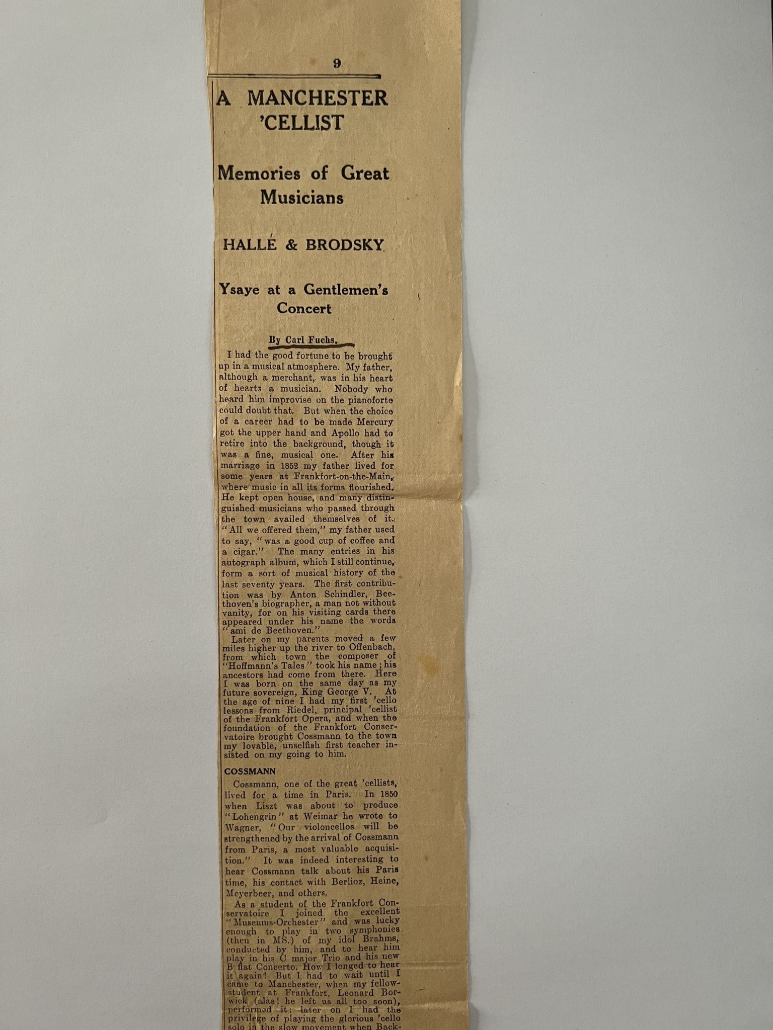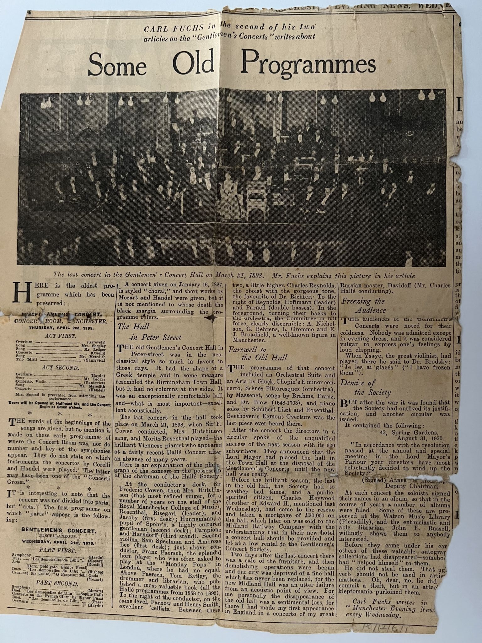 Four articles. Two are part of a series, 'A Manchester Cellist', the first details memories of Hallé and Brodsky and describes how Fuchs came to Manchester; the second includes memories of Richter and Fuchs' internment in Germany during the First World War. The third piece [from the Manchester Evening News] deals with the history of the Gentlemen's Concerts and includes a photograph of the last such concert in 1898. In the fourth Fuchs talks about his travels with the Brodsky Quartet.