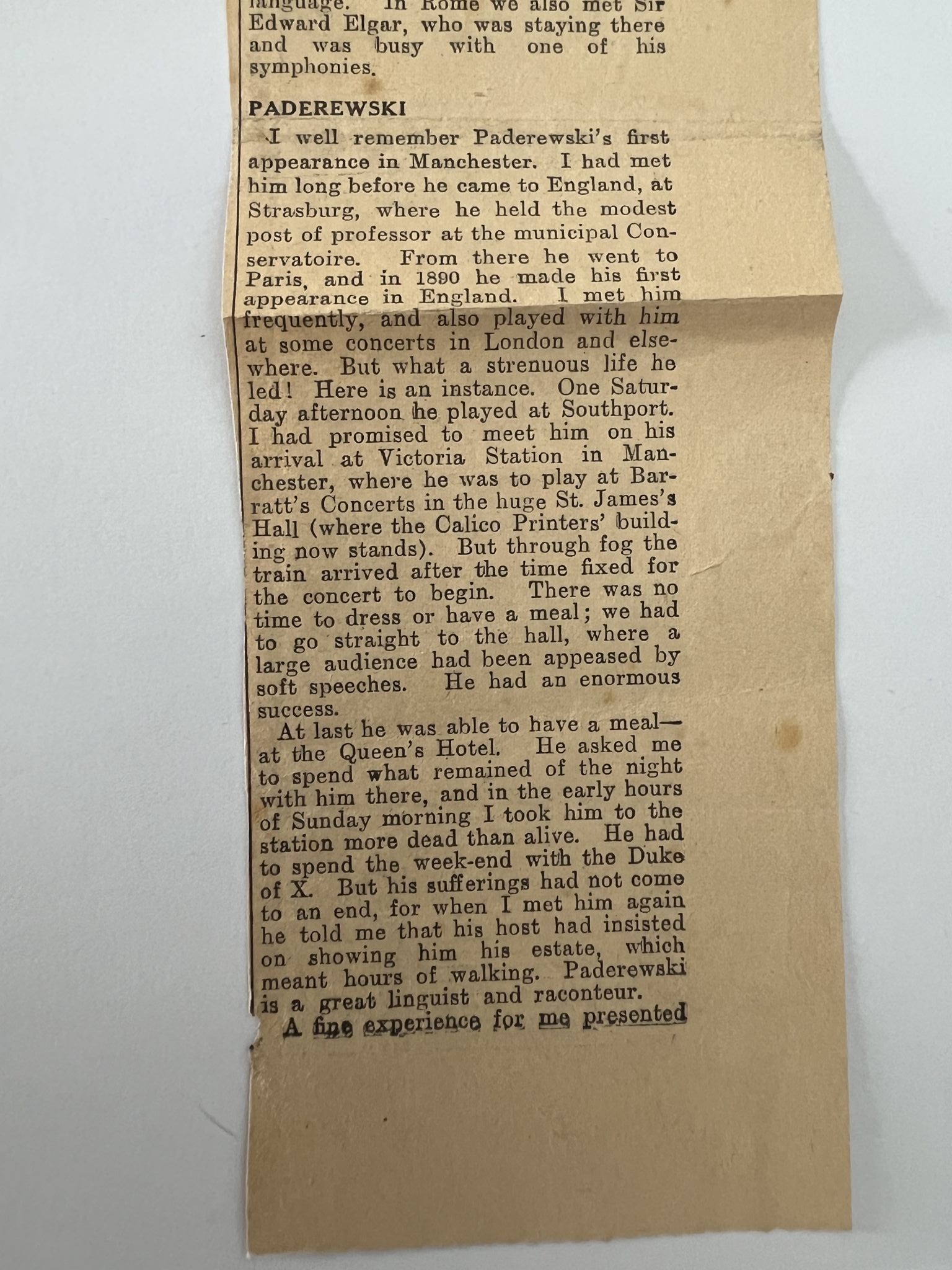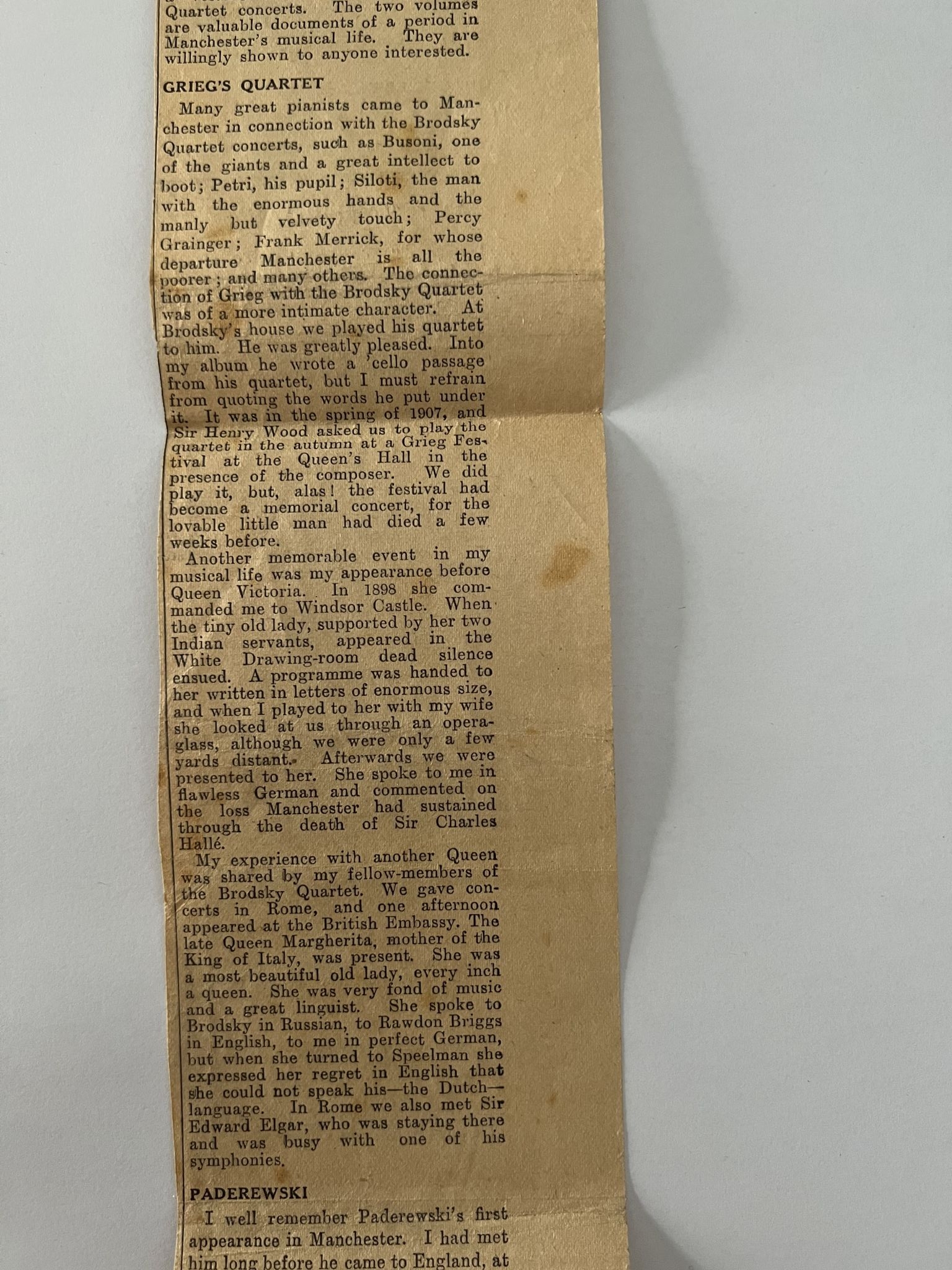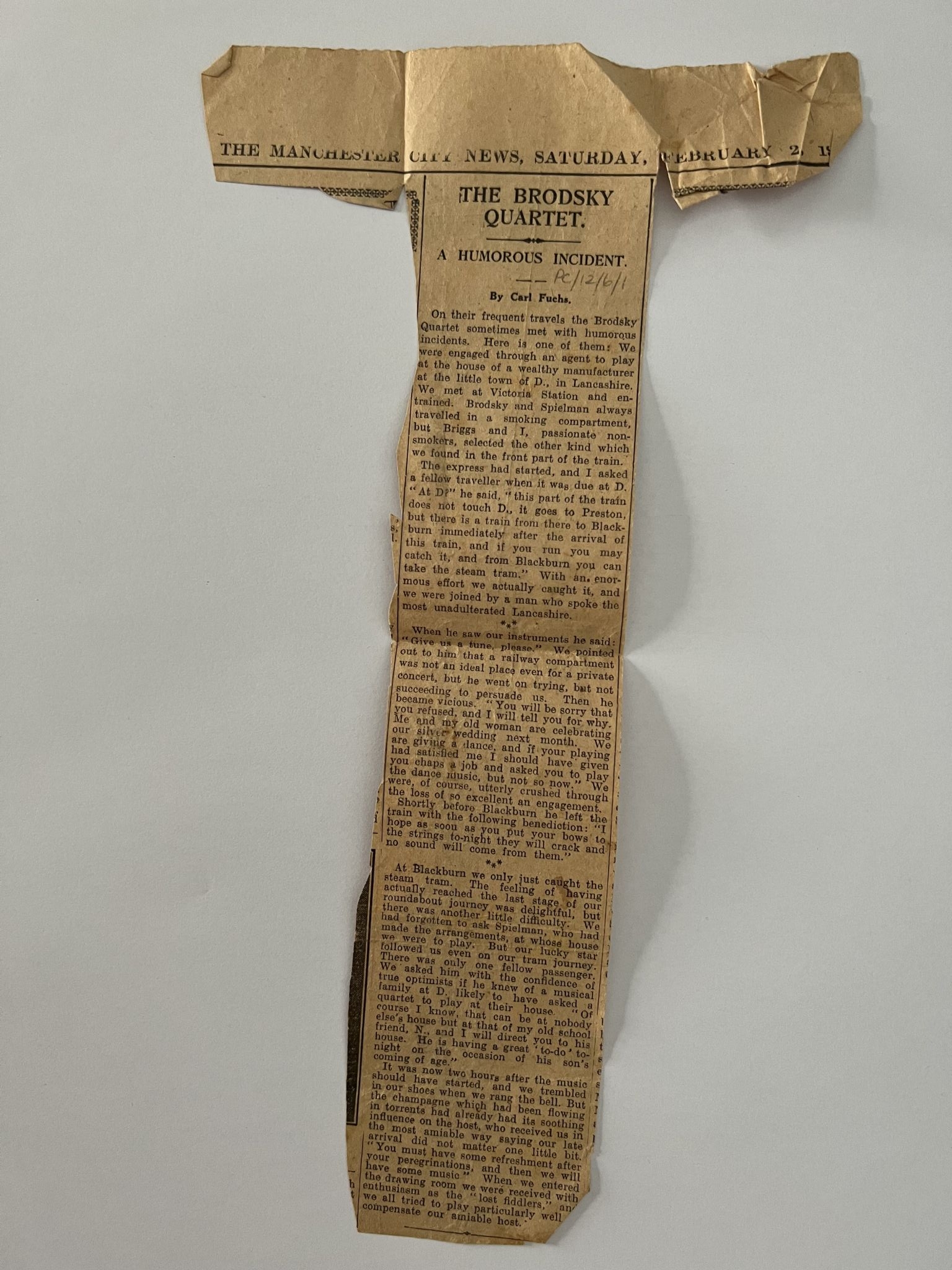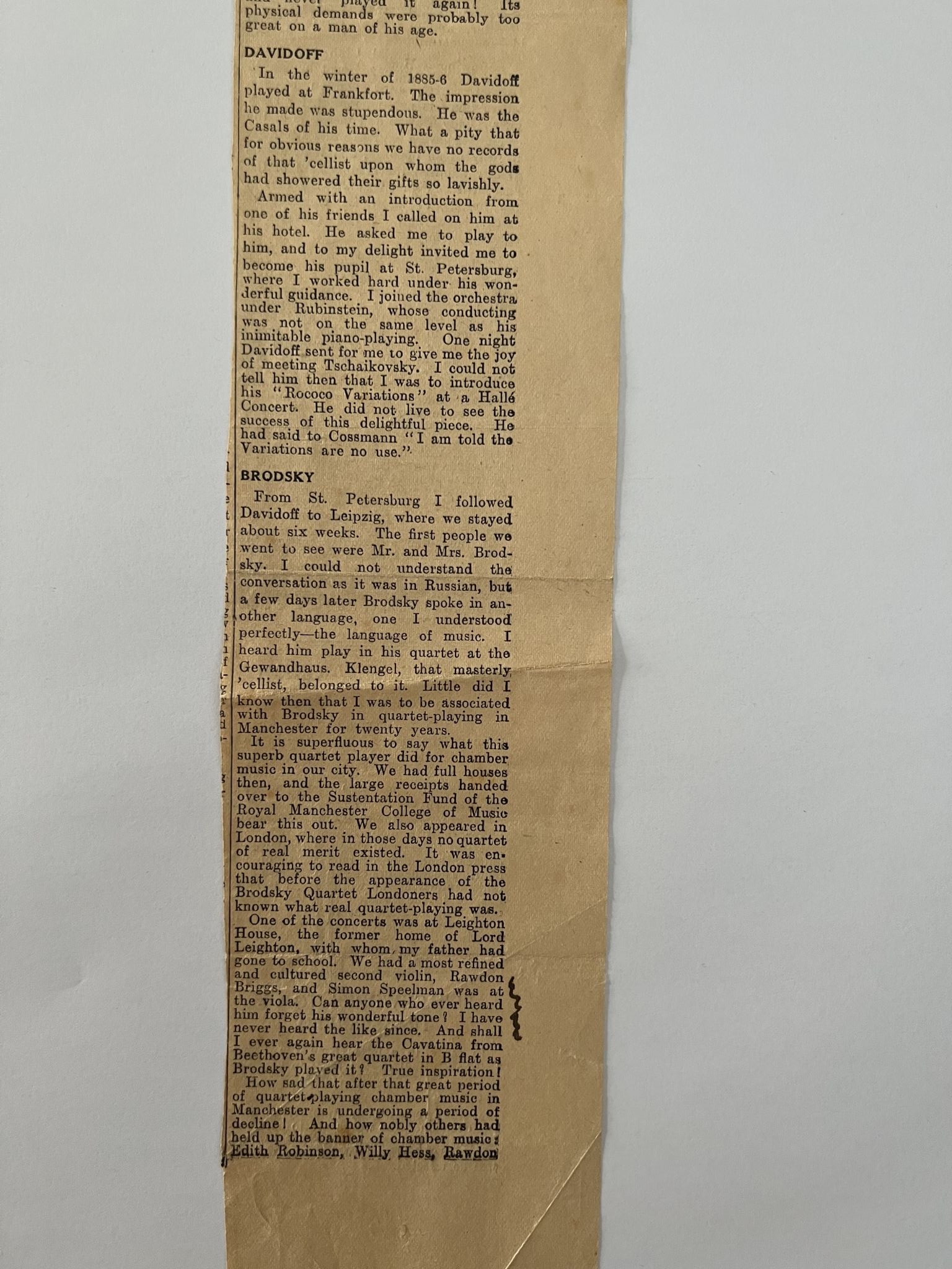 Four articles. Two are part of a series, 'A Manchester Cellist', the first details memories of Hallé and Brodsky and describes how Fuchs came to Manchester; the second includes memories of Richter and Fuchs' internment in Germany during the First World War. The third piece [from the Manchester Evening News] deals with the history of the Gentlemen's Concerts and includes a photograph of the last such concert in 1898. In the fourth Fuchs talks about his travels with the Brodsky Quartet.