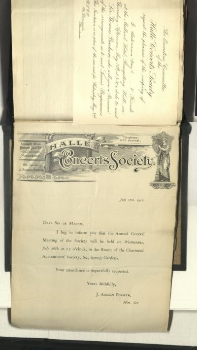 Notification of the forthcoming AGM of the Halle Concerts Society, July 1916.